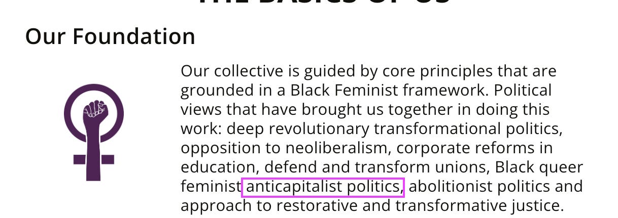 How do we know it’s socialism? Because on page five of the manual, it flatly states that their work is grounded in “anticapitalist politics” alongside a bunch of other key socialist phrases, like neoliberalism (socialists hate neoliberals), revolutionary politics, abolitionist politics (that means getting rid of police and jails) and restorative justice.