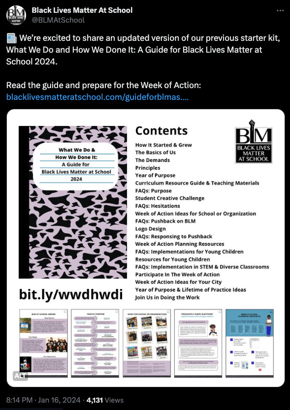 Did you think they stopped teaching Critical Race Theory in schools? Think again! Just today, Black Lives Mater at School released their 2024 manual for educators to help them integrate socialism into their curriculum.