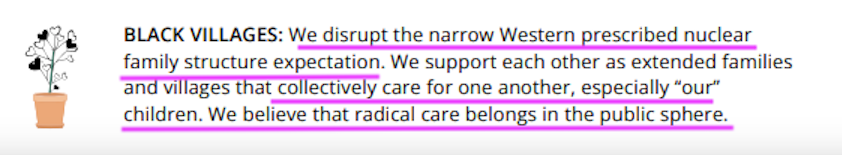 And on page 9, they explicitly call for the disruption of the nuclear family for the purpose of “collectivizing care” and “radicalizing care” which means a world in which all healthcare is public and free, with no private doctors or insurance companies allowed.