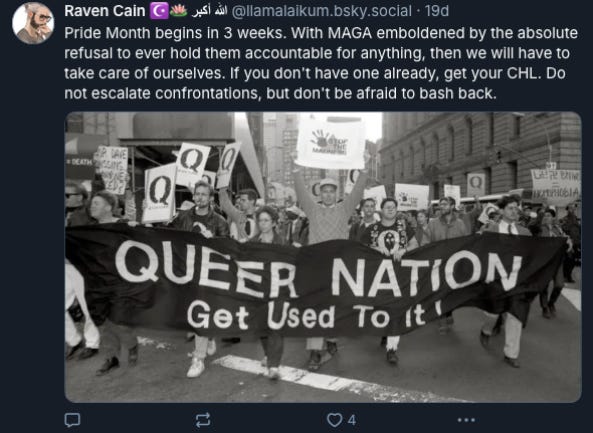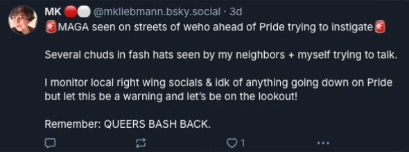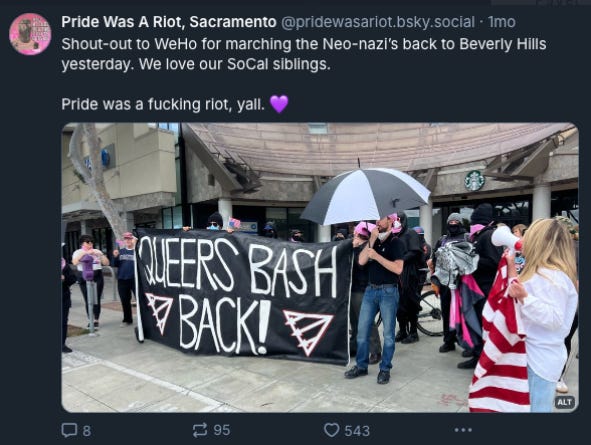 I fully expect riots, vandalism, and targeted violence at Pride events across the country. Not because of right-wing protesters. But because Bash Back has always believed in “liberation through destruction.”