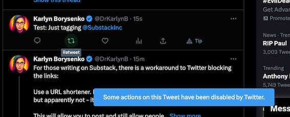 Twitter is also disabling any tweets that tag the official Substack twitter account. Just moments ago, I posted this tweet and then tried to RT it. Twitter told me I wasn’t allowed to complete that action.