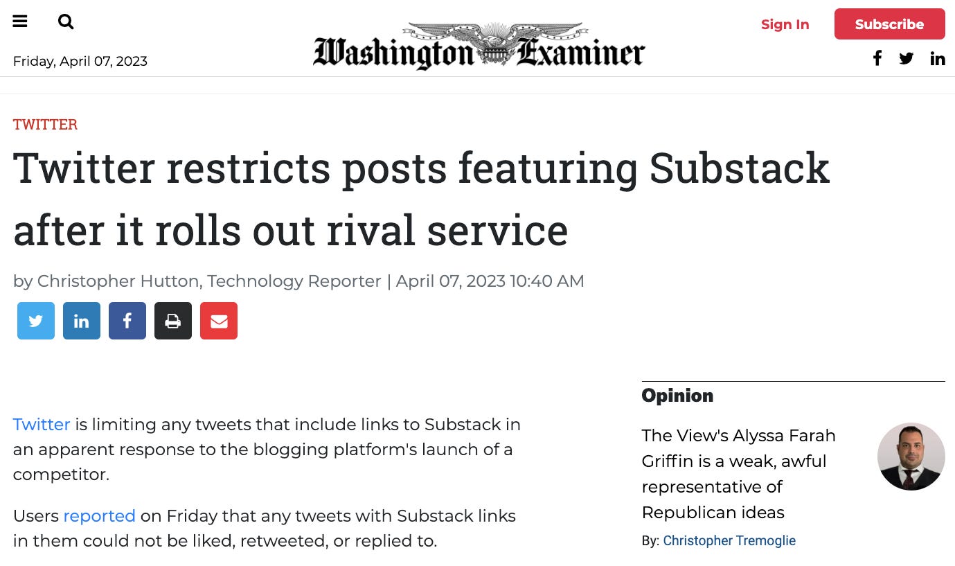 According to The Washington Examiner, Twitter is proactively disabling any tweets with links to Substack articles. If you post a link to a Substack article, no one will be able to like, retweet or reply to that tweet, no matter the content of the article.