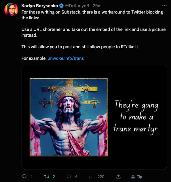 I took the URL from my trans martyr article that Twitter was blocking and used URL shortener to make a new URL: http://unwoke.info/trans