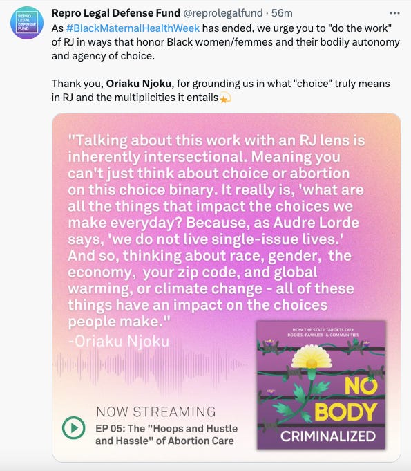 Oriaku Njoku (she/they): A first-generation, Black, Igbo, Nigerian-American, Kentucky-raised, queer, fat, Southern femme, healing-centered coach living and loving in Atlanta, Georgia, Executive Director of the National Network of Abortion Funds.